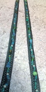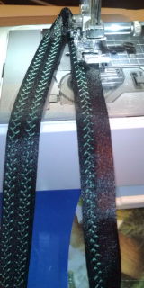 まず黒の縁取りテープに緑の糸でステッチ入れて、