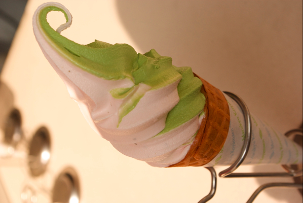 桜と抹茶のミックスソフト食べ〜の、