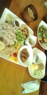 ニーナちゃんと大塚屋付近でヘルシーランチなう\(^p^)/大豆ハンバーグに雑穀米だよ!