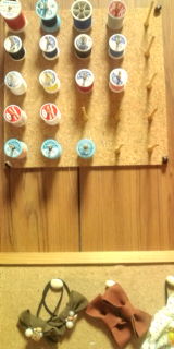 発泡スチロールに布巻いてピンでとめてあるだけ簡単収納だよ^^